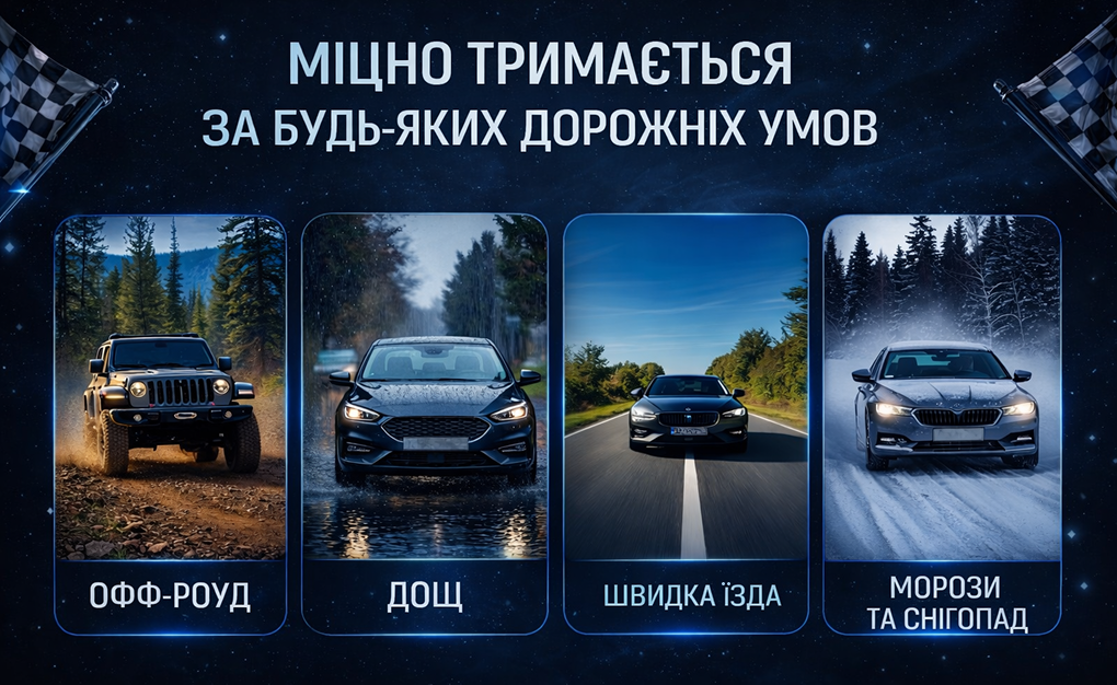 Надійно фіксується та не спадає за будь-яких дорожніх умов під час руху автомобіля.